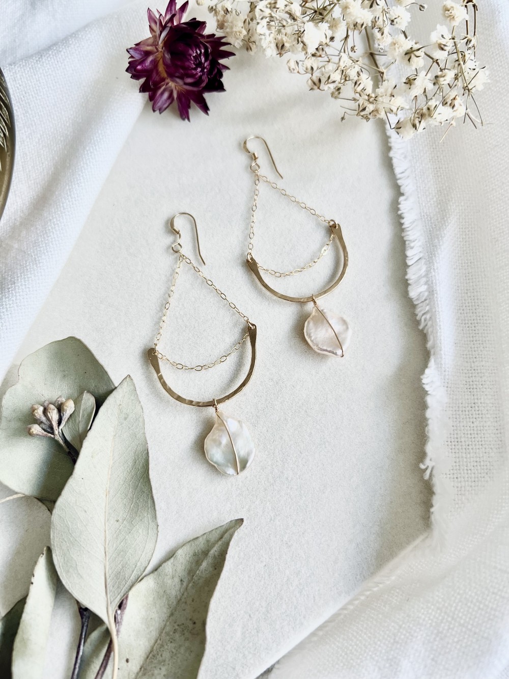 Dangly earrings with dainty cable chain accents, hand-forged half-circle shape with hammered texture, and wire-wrapped keshi pearls
