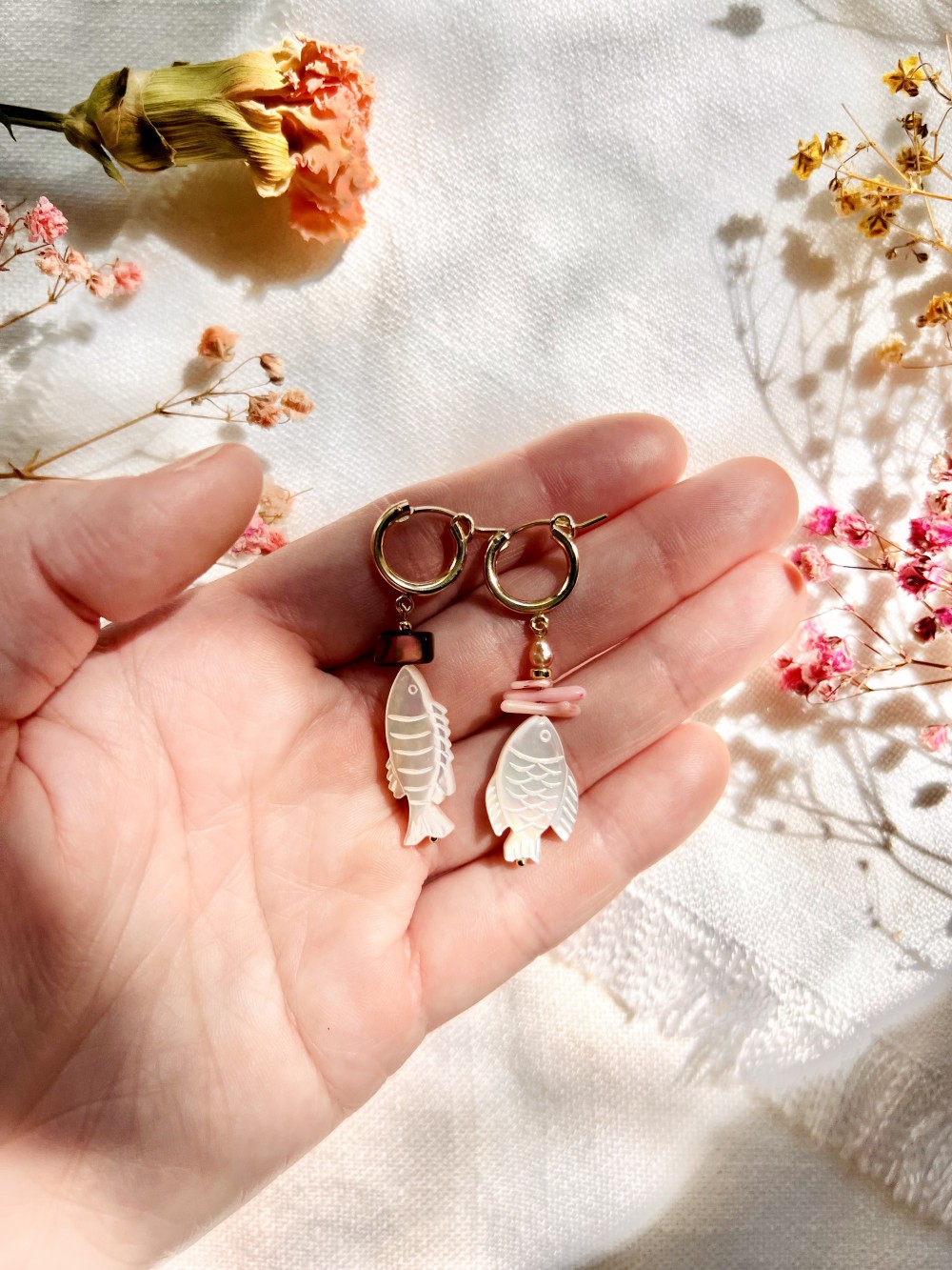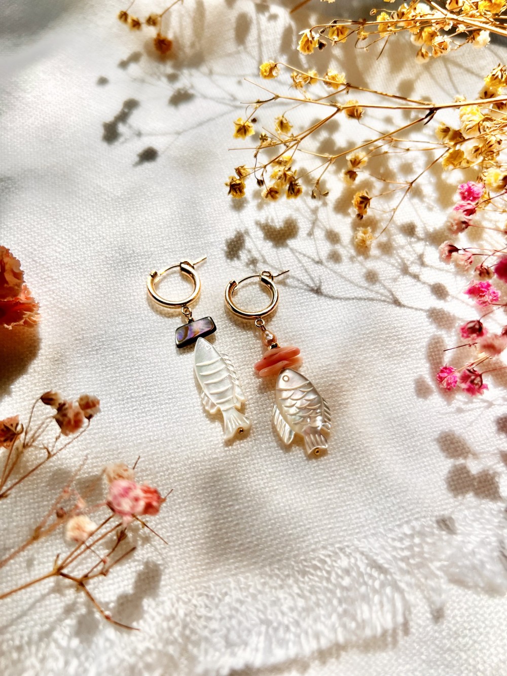 14k gold filled huggie hoop earrings with mismatched mother of pearl fish, abalone chip, pink coral, and pink freshwater pearl. Metal is lead and nickel free, and hypoallergenic. 2" length