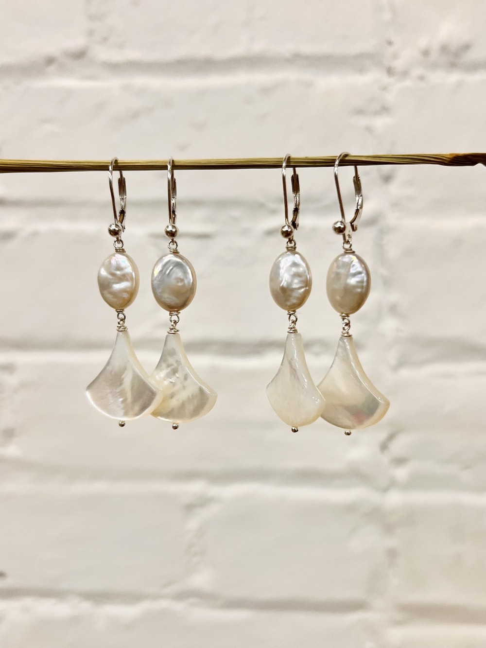 Sterling silver lever back earrings with white oval freshwater pearls and mother of pearl "fans". Metal is lead and nickel free and hypoallergenic. 2.25" length