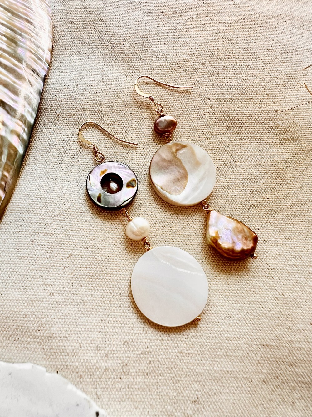14k gold filled mismatched earrings with MOP discs, abalone, and mixed mauve and white freshwater pearls