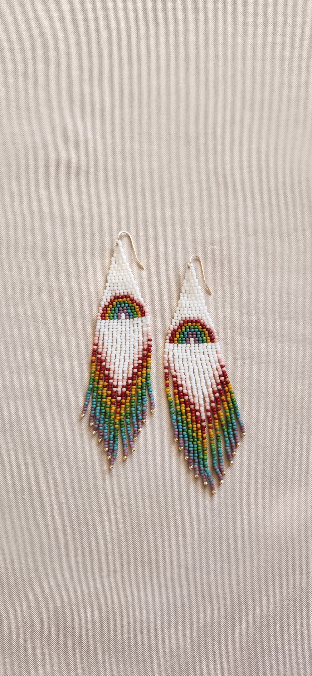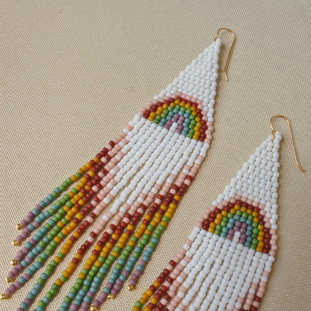 Beaded rainbow earrings with tapered fringe, handcrafted with glass seed beads.