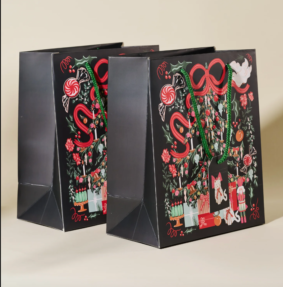 Making gift wrapping easy, these paper gift bags feature charming illustrations and braided rope handles. Made of sturdy printed paper, this bag will be sure to delight! Each bag includes a small tag.