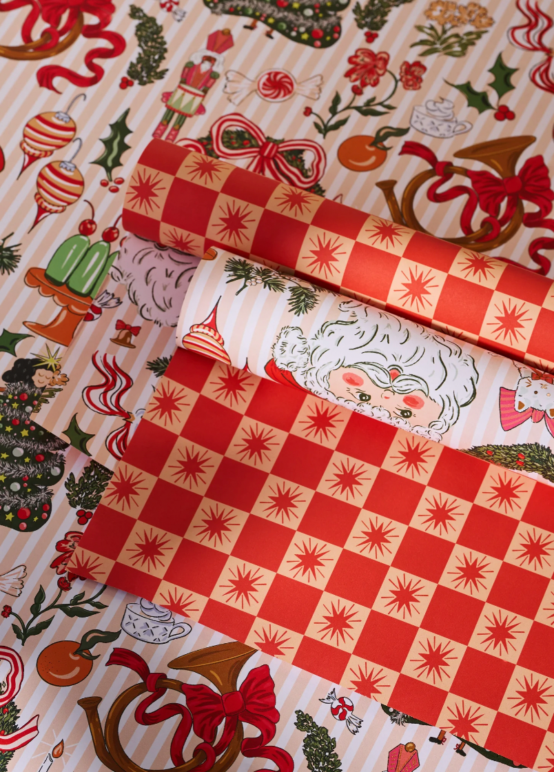 This set includes three double-sided sheets, each measuring 20 x 29 inches—plenty for wrapping a generous stack of presents. Sheets arrive rolled for easy storage and use.
