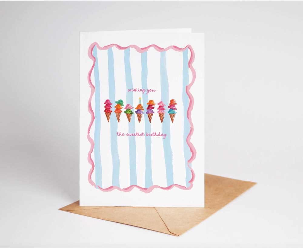 Send a sweet treat with this adorable 5x7 birthday card, featuring watercolor rainbow ice cream cones on a background of stripes with the phrase "wishing you the sweetest birthday". The card is blank inside for your own personal message, and comes with a brown kraft envelope. Perfect for dessert lovers and birthdays!