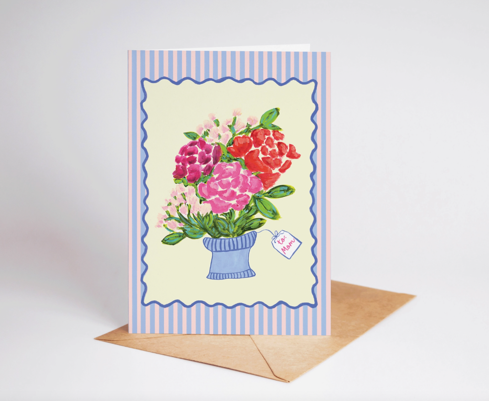 Give moms their flowers with this beautiful 5x7 card, featuring my watercolor artwork of red, purple, and pink flowers in a blue vase and the simple phrase "to: Mom". The card is blank inside for your own personal message, and comes with a brown kraft envelope. Perfect for Mother's Day, mom appreciation, mom birthdays and more!