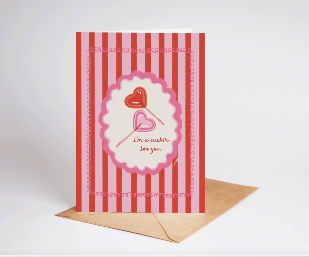 Let them know you're sweet on them with this adorable 5x7 card, featuring red and pink heart suckers and the phrase "I'm a sucker for you". The card is blank inside for your own personal message, and comes with a brown kraft envelope. Perfect for Valentine's Day, anniversaries, significant others, dessert lovers, and more!