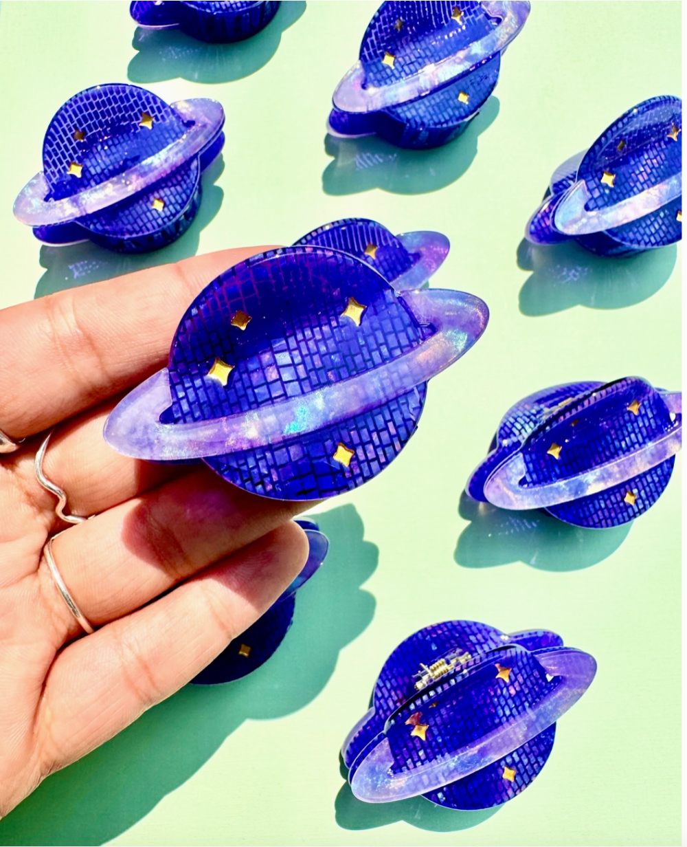 A mini hair claw that’s out of this world. These hair claws are made from eco-friendly cellulose acetate. They are perfect for adding color to any outfit. They are 1.75 inches long and1.75 inches wide.