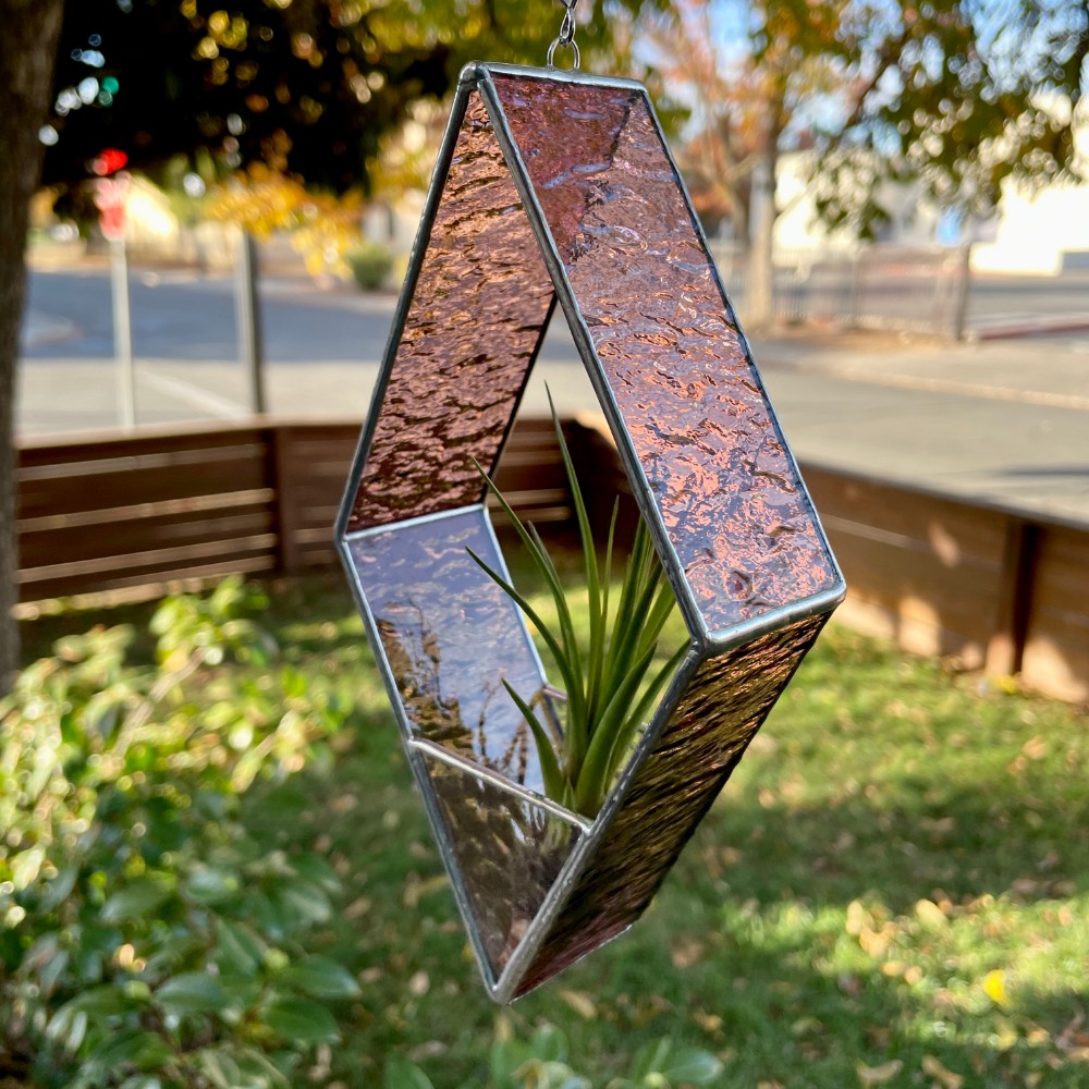 Handmade stained glass suncatcher securely holds air plant while basking it in the sunlight.
