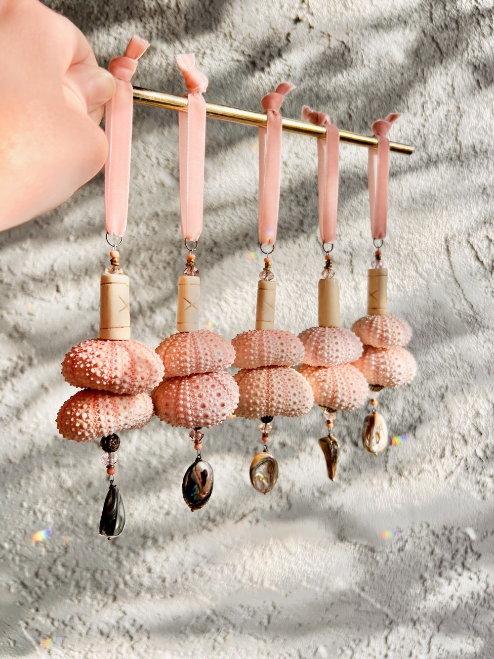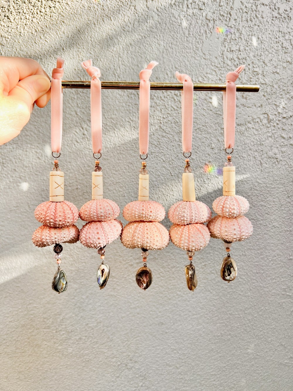 Pink sea urchin shell ornament with pink velvet ribbon and various beads including abalone, glass, bone, lava rock, synthetic pearl, and antiqued brass plated accents. Please note that due to the nature of the materials, each piece will vary slightly.