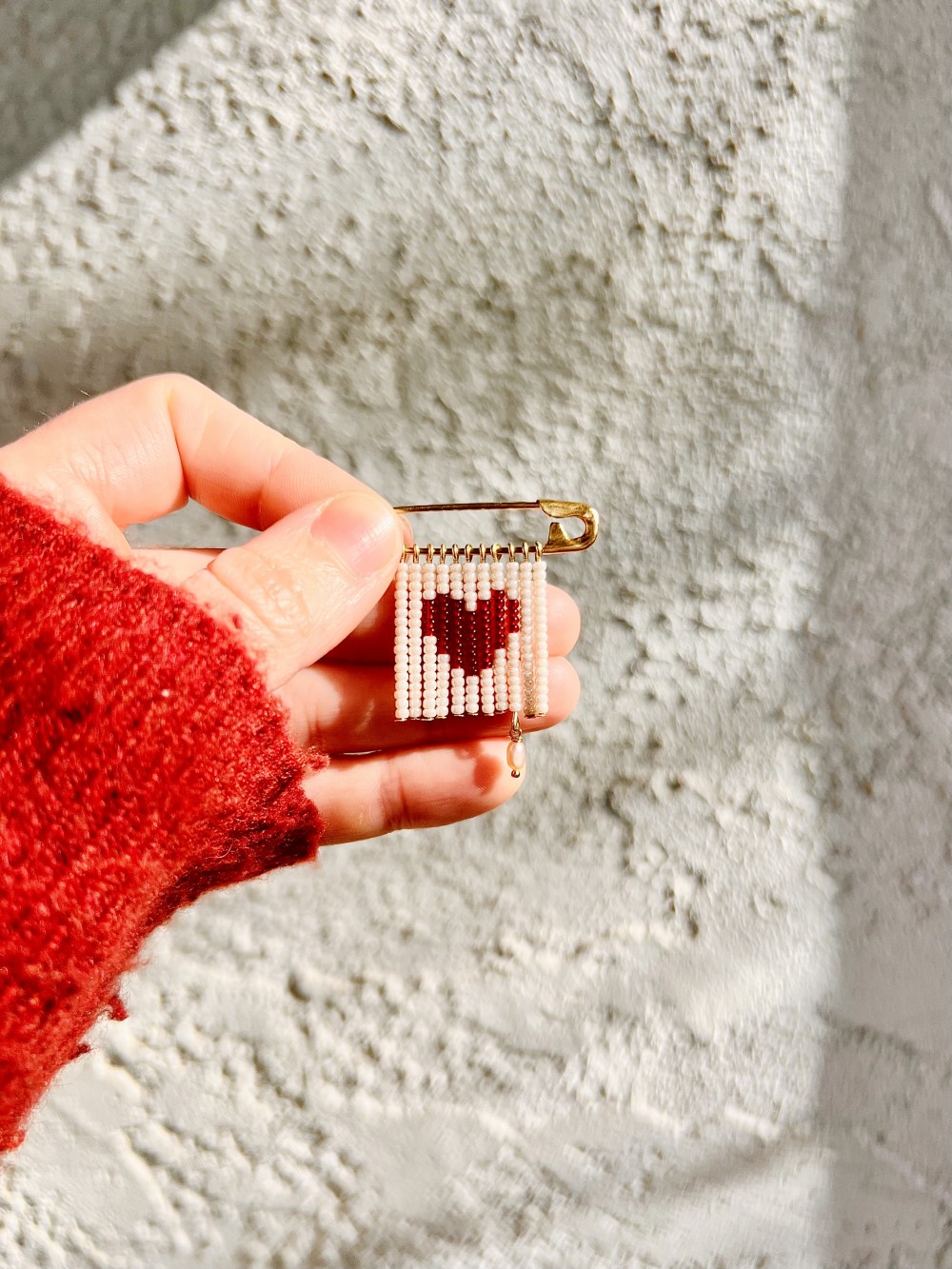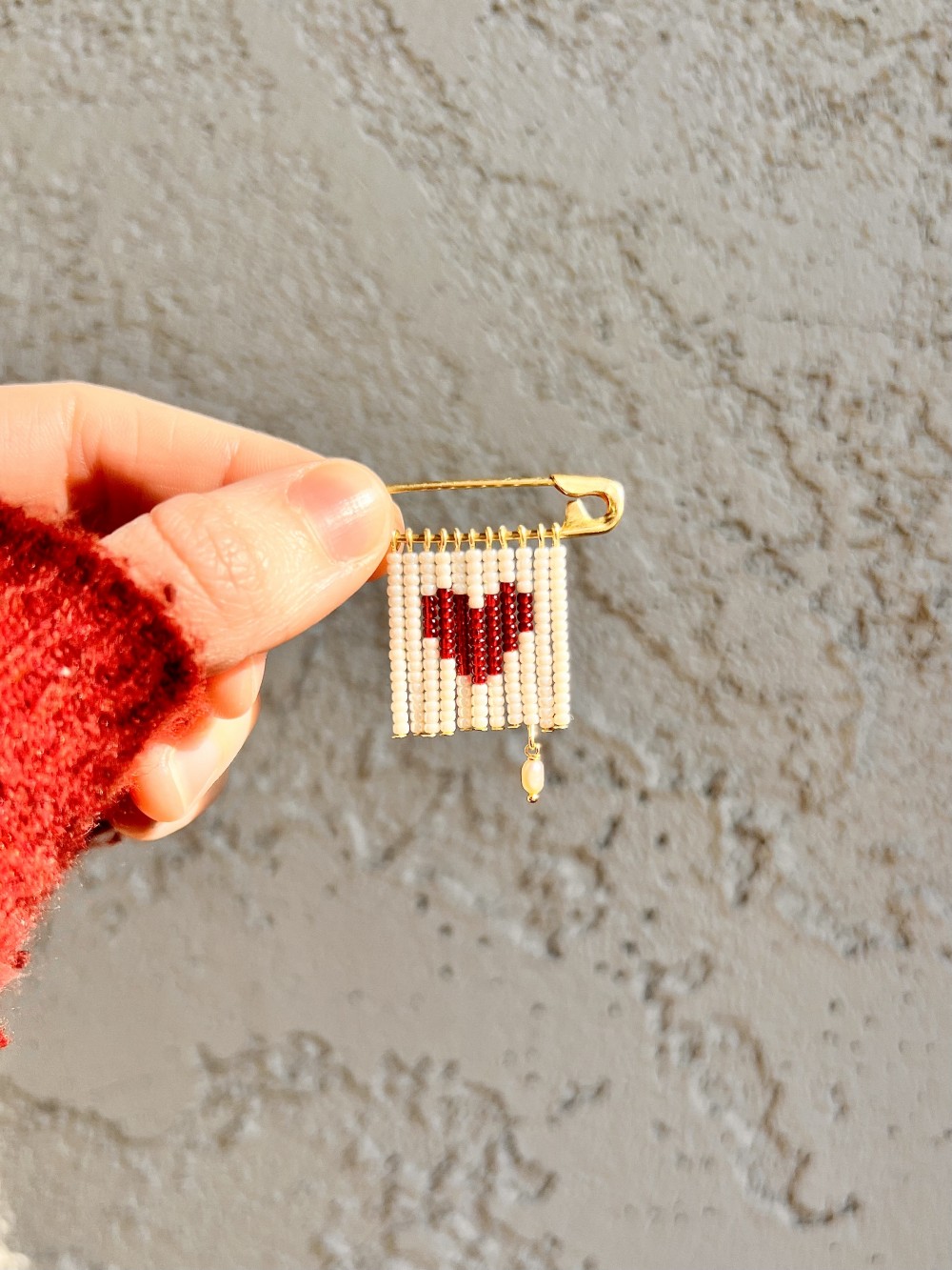 Brass safety pin brooch with glass seed beads and pink freshwater pearl charm