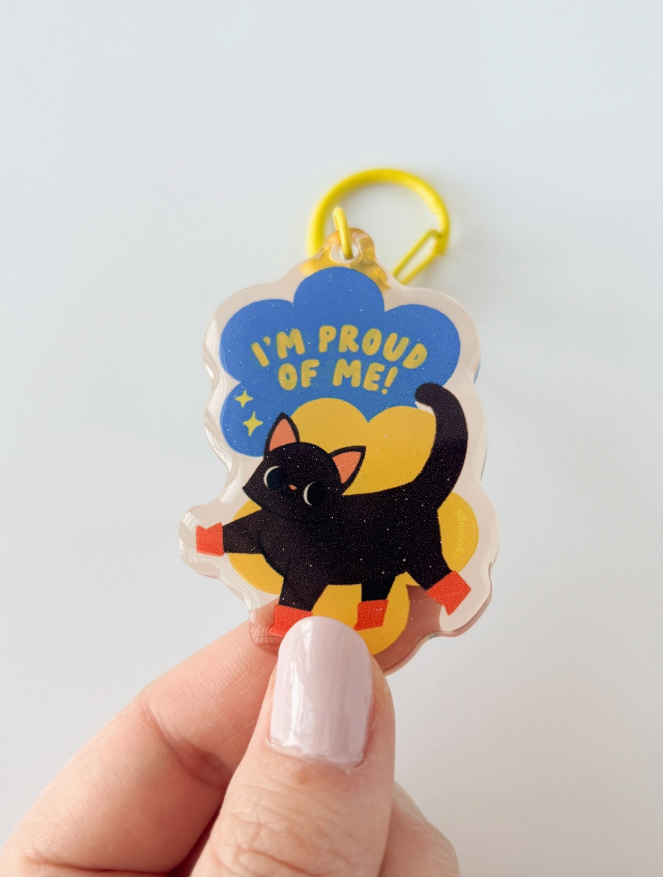 Illustration features a black cat with little red boots proclaiming "I'm proud of me!". Illustration was drawn as a celebration of my own accomplishments :)