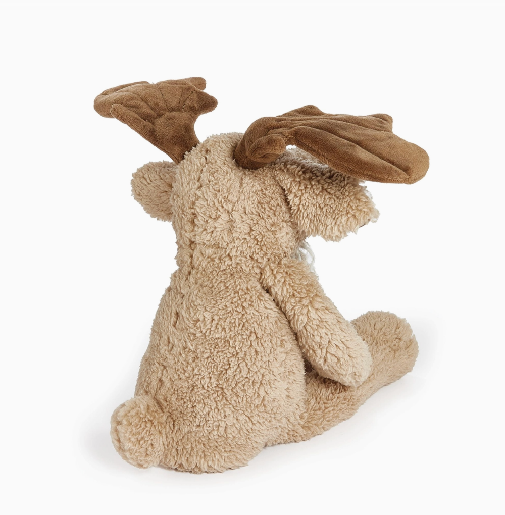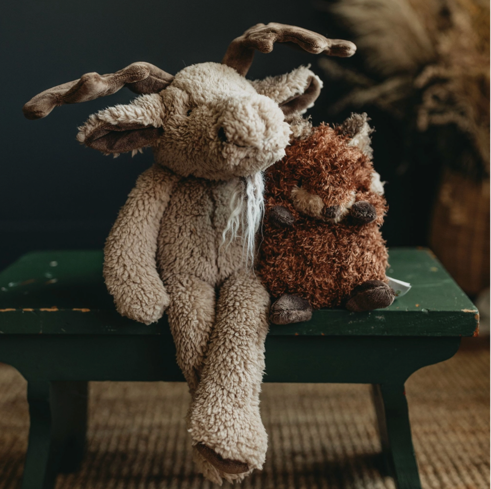 Come on, who wouldn’t love to hug this BIG guy? Bruce the Moose is super soft fur in warm taupe with acorn brown antlers. Hand-embroidered face and a handsome goatee under his chin. This woodland stuffed animal friend is the Hero of our hearts, and our Camp Cricket Book. Signature three carrot tag for little one's fingers.