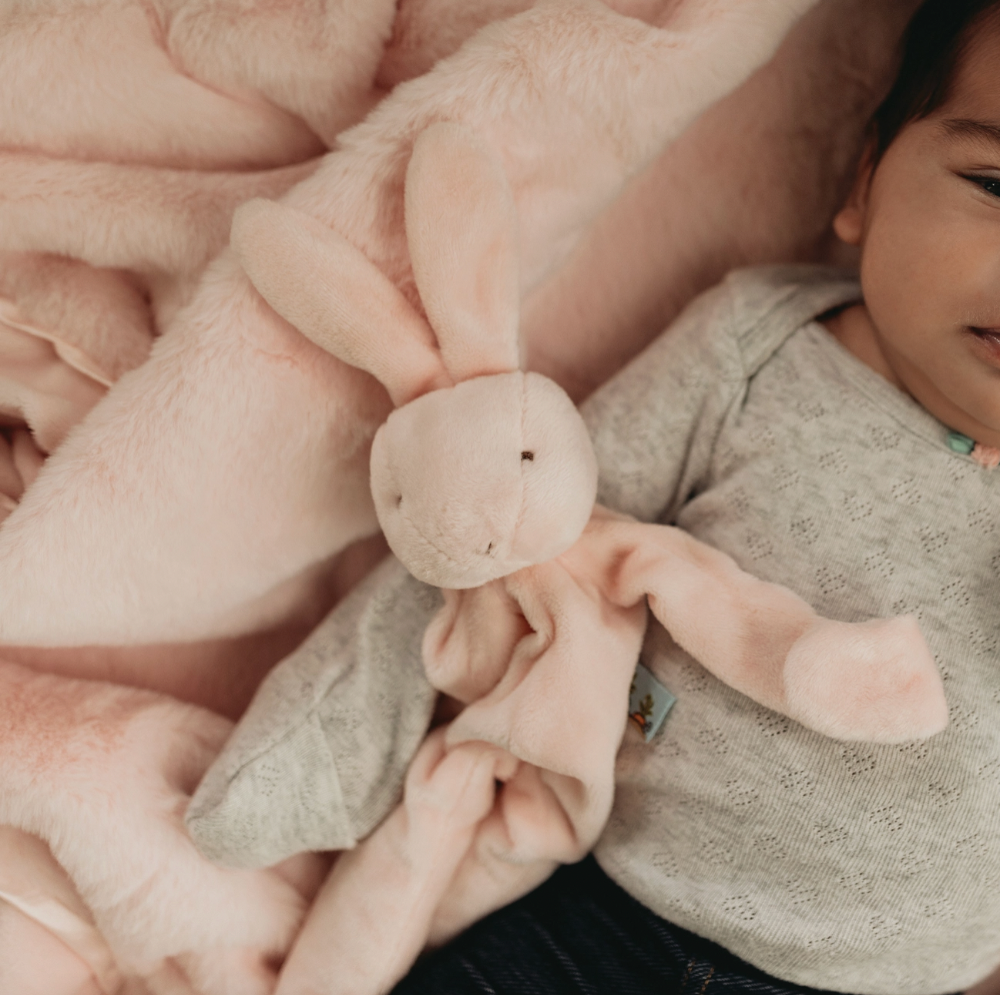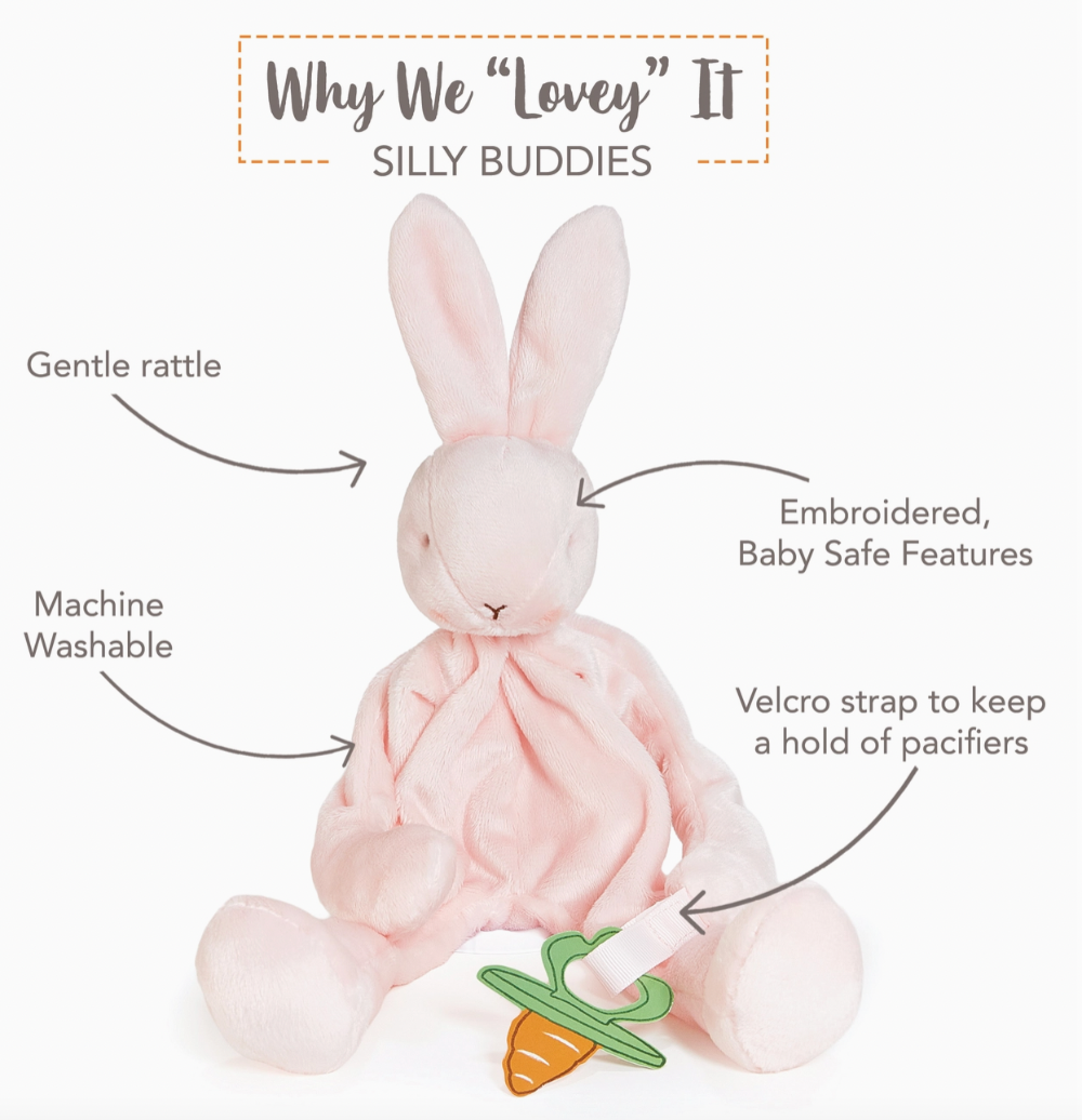 The Blossom Bunny Silly Buddy animal pacifier holder is the perfect gift for your wee one with multiple ways to soothe. Super-soft and floppy, super silly, and oh-so useful, this take-a-long pal will tie onto a baby's stroller, crib, or car seat. With a pacifier holder hand loop and fun rattling head, this is sure to be a favorite security item of Baby and Mom and Dad alike!