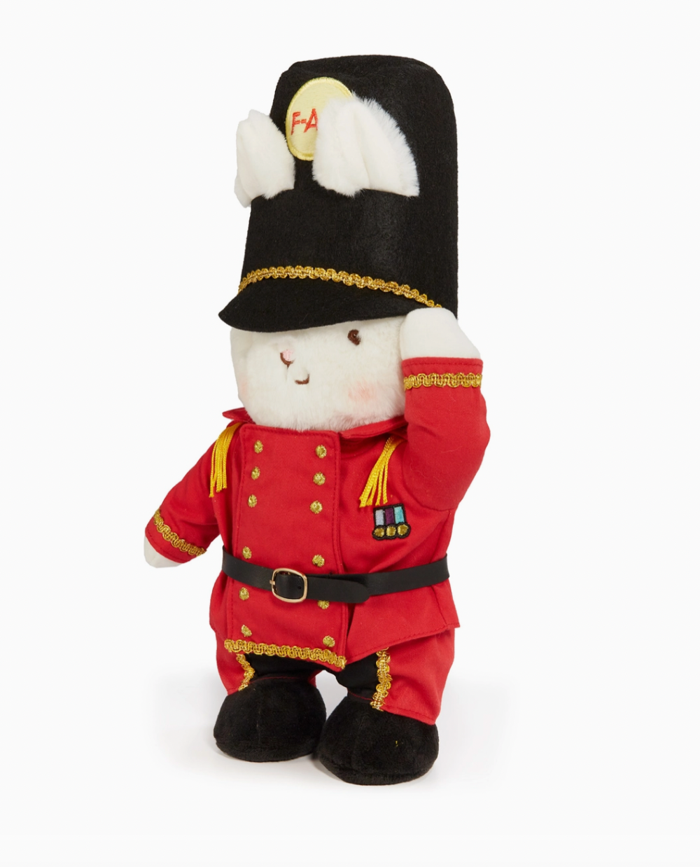 In celebration of FAO Schwarz's 160th Anniversary, we present the Toy Soldier Bunny! Ready for duty and adventure this dashing stuffed bunny is perfectly dressed in the iconic red toy solder suit and black hat. Poised in a salute, the way any good soldier stands, this stuffed animal plush bunny is anything but ordinary, and the perfect memento of a trip to the famous FAO Schwarz Toy Store, or a way to spark the imagination and dreams of such an adventure. At 13 inches tall, this bunny is the perfect size for little hands to hold, or to stand on a shelf for room decor.