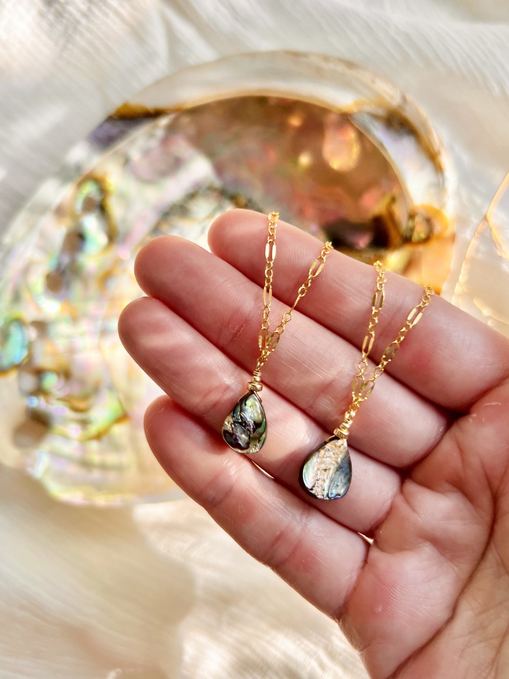 Dainty 14k gold filled chain with abalone teardrop. Metal is lead and nickel free, and hypoallergenic.
