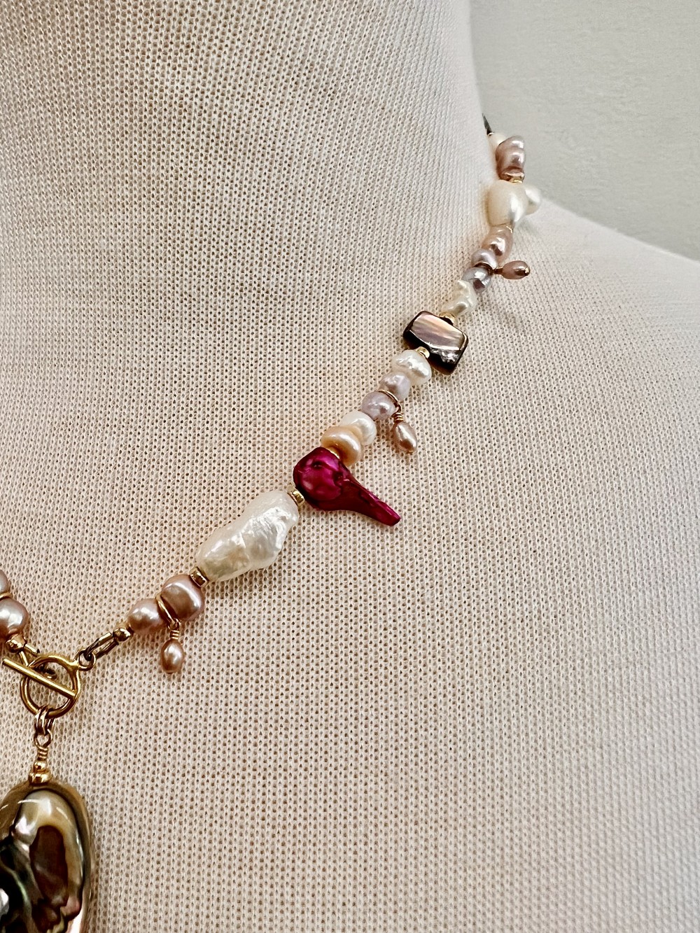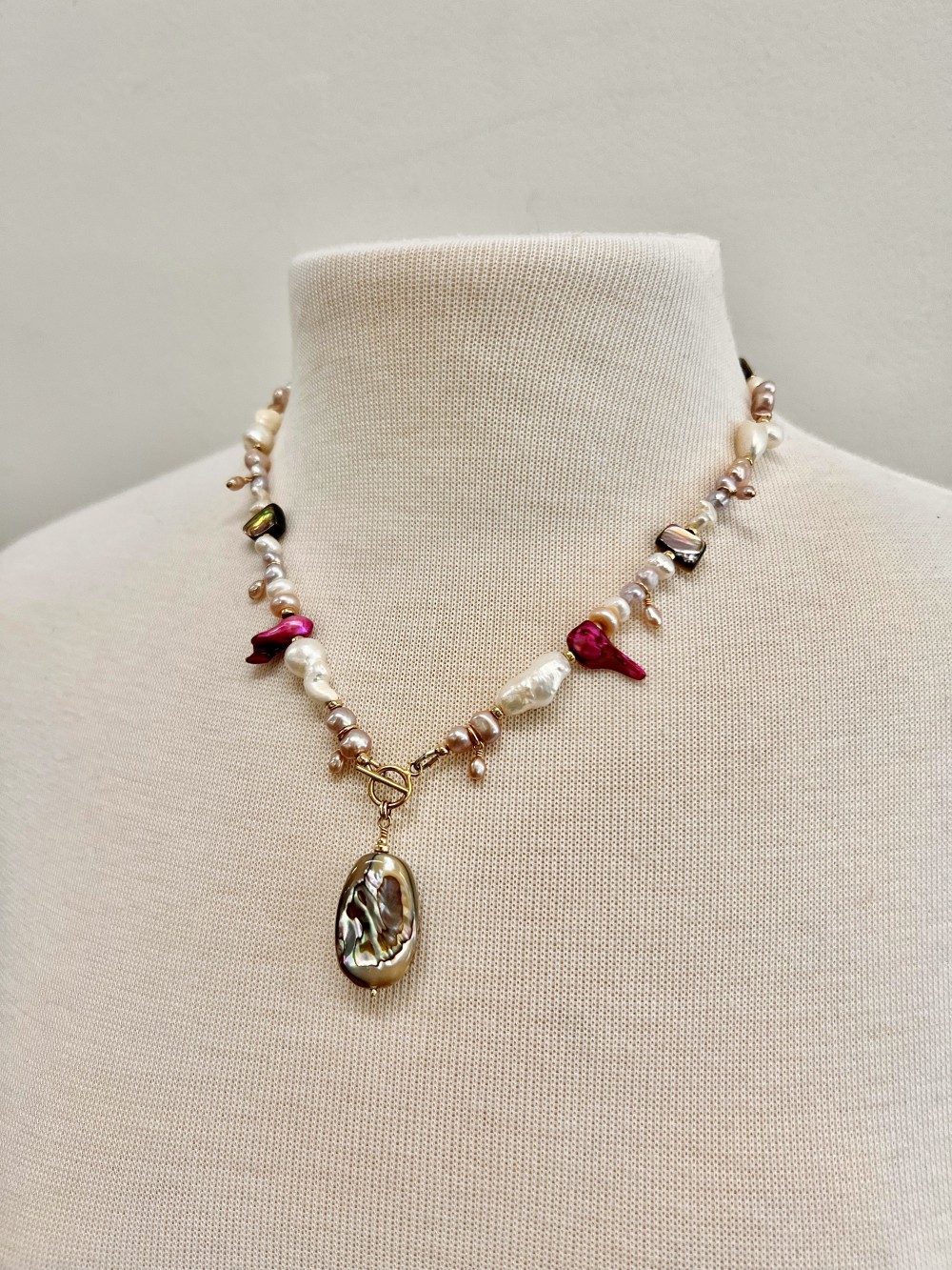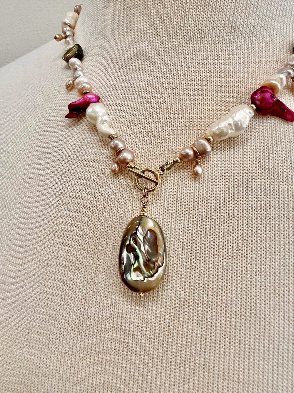Statement necklace beaded with various pink, purple, and white freshwater pearls, abalone chips, Biwa pearls, fuchsia fireball pearls, and smooth abalone pendant