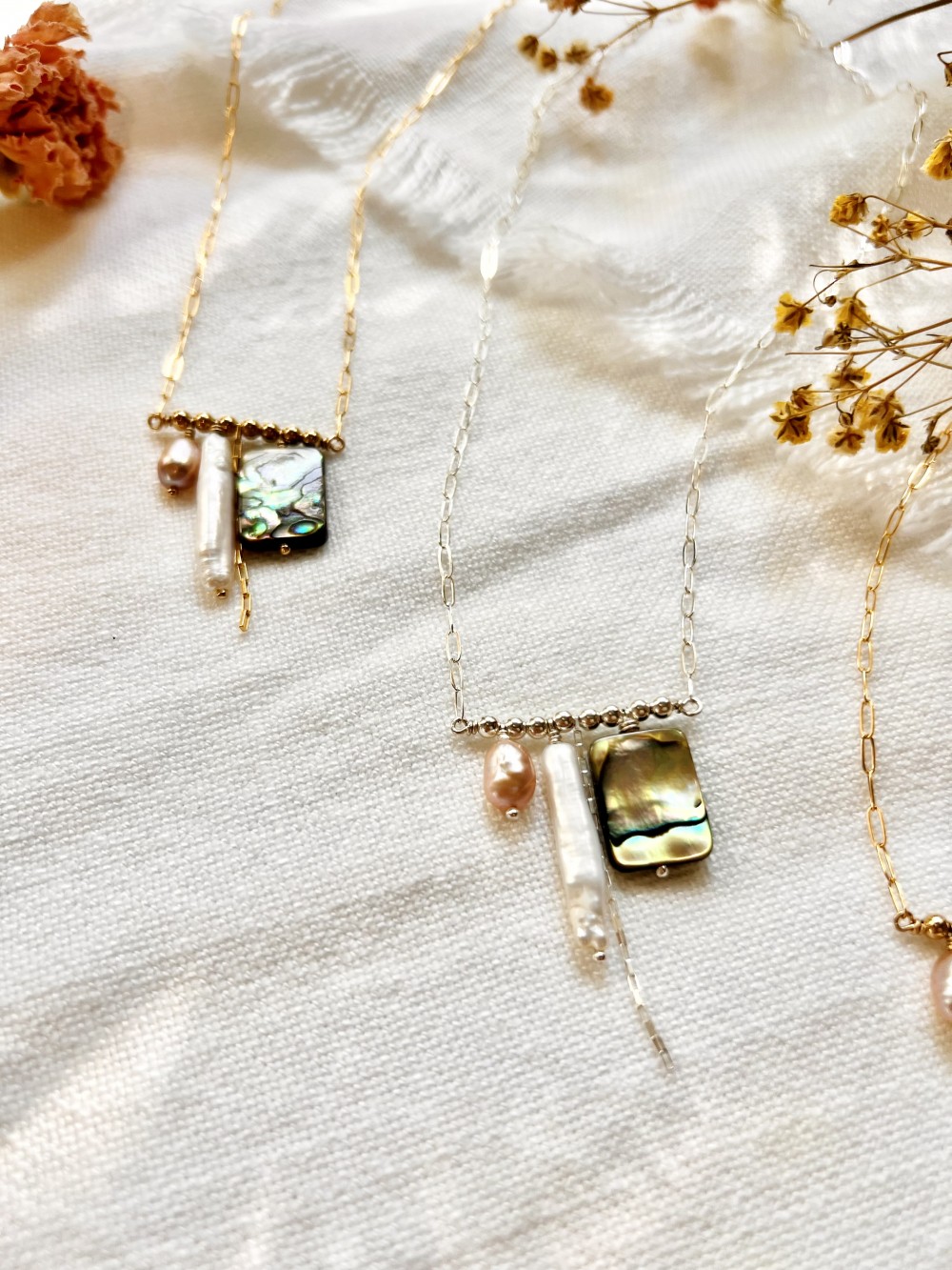 Paperclip chain necklave with abalone, pink freshwater pearl, stick pearl, and scrap chain accent