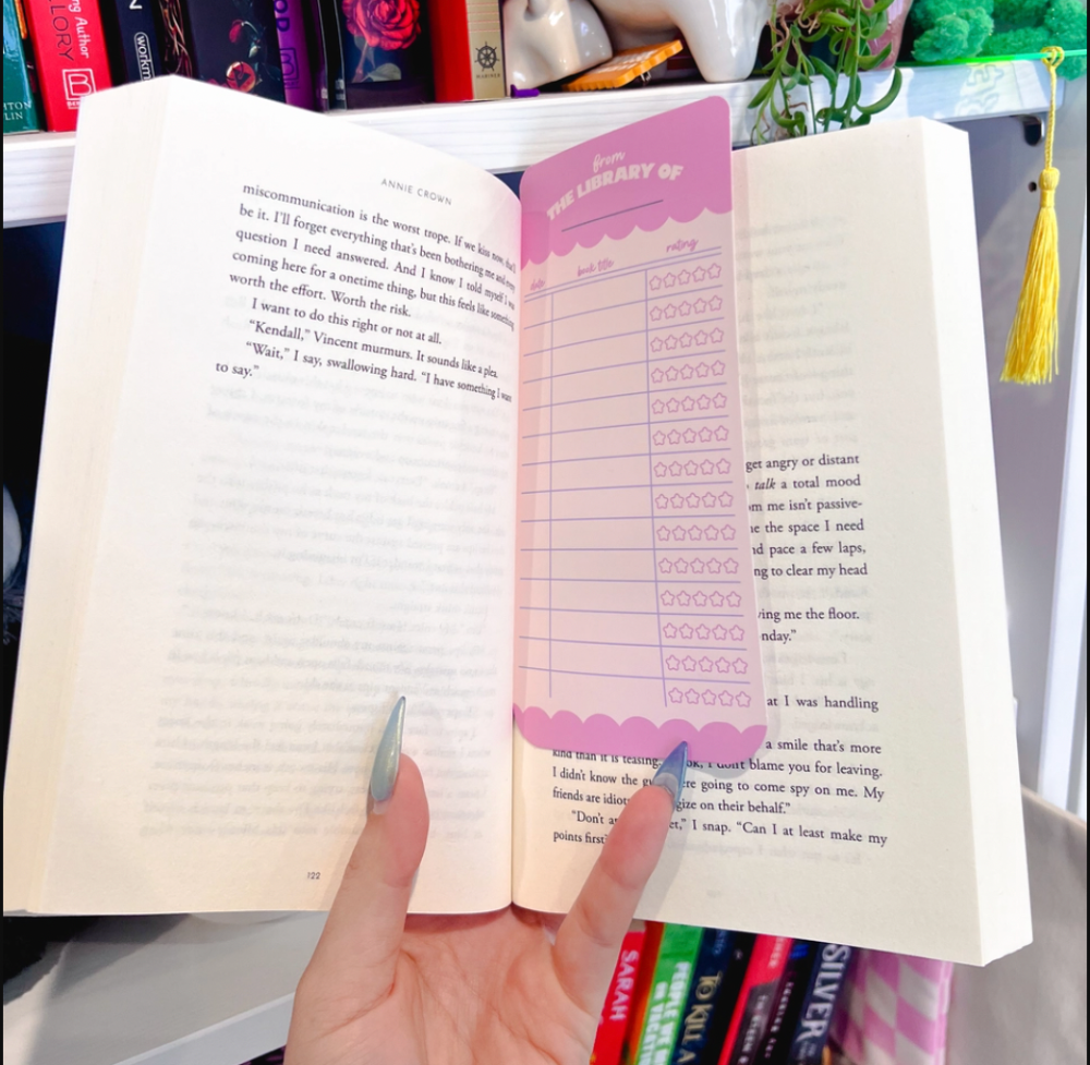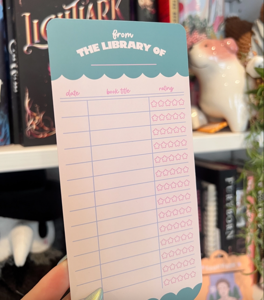 Double sided bookmark with spots to write down the books you have read and a star rating for them!