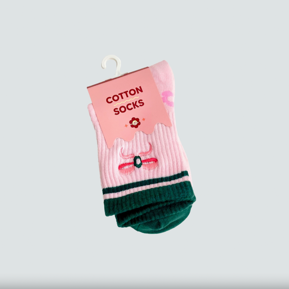 Say hello to our version of a classic crew sock! These Pink Bow Cotton Socks deep green sporty stripes and an embroidered bow for the perfect mix of sporty and chic!