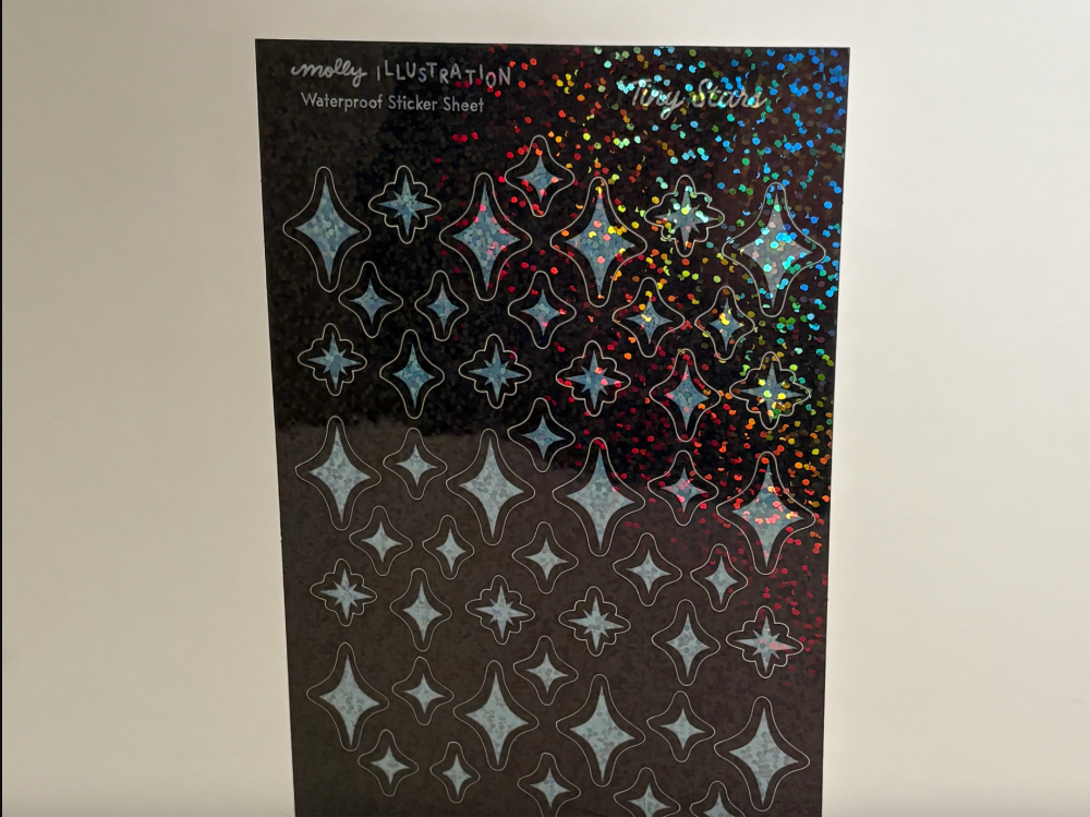 This sticker sheet is printed on waterproof glitter vinyl. Perfect for filling gaps on water-bottles, laptops, notebooks, helmets, sketchbooks, bikes, and more.