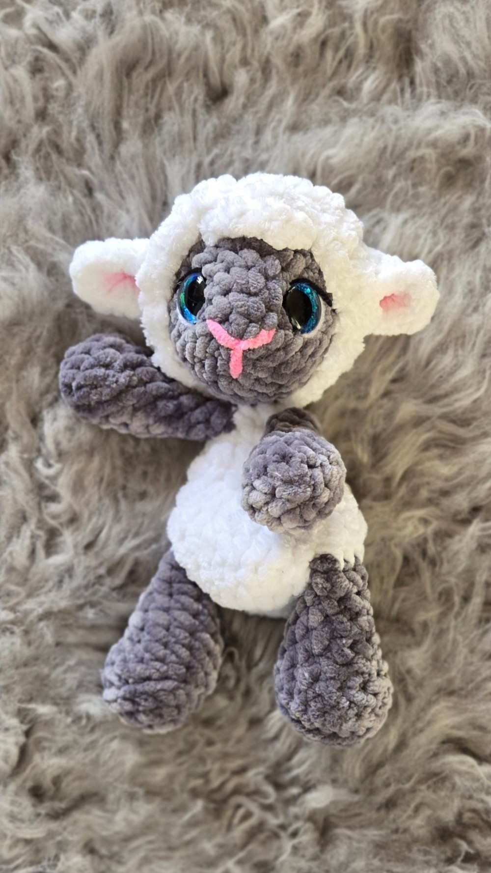 Handmade crochet lamb plush snuggler, 9” tall, chenille yarn with polyfiber-filled head and limbs, unstuffed cuddle body, handpainted blue eyes.